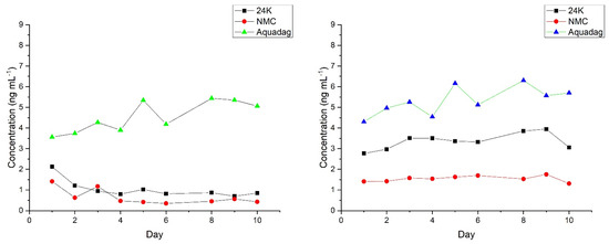 Aquadag samples of presonication (left) and post-sonication (right) after long-term placement.
