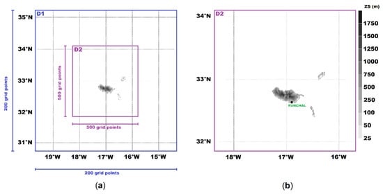 The numerical simulations were performed using the Meso-NH, a non-hydrostatic model able to represent the atmospheric environments in different time and spatial scales, with a wide range of parametrization schemes for several physical processes observed in the Earth’s atmosphere [,]. Here, it was configured into two domains as shown in Figure 1. The outer domain was configured with 200 × 200 grid points and 2.5 km resolution. To access the effects of the rugged local surface, an inner domain was designed with a resolution of 500 m (500 × 500 grid points), capable of better representing the complex terrain characteristic of the mountainous island. The vertical grid was calculated automatically by the model with a total of 50 levels following the terrain. The simulations were performed in a two-way interactive mode, initialized and forced using the European Centre for Medium-Range Weather Forecasts (ECMWF) analysis updated each 6 h.