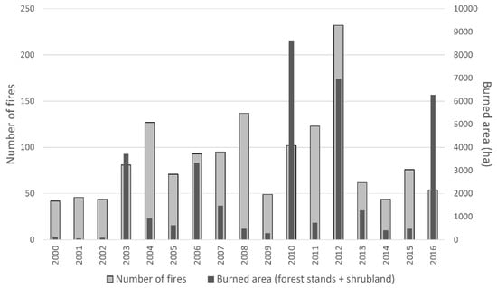 Annual distribution of the number of fires and burned area affecting forest patches and shrubland between 2000 and 2016. The official statistical data presented here did not count the total burned area, only the area affected by fire covered by forest stands and shrubland. Data source: based on official statistics published in [] for the period between 2006 and 2016; and Paulo Fernandes for the period between 2000 and 2005 (see acknowledgments).