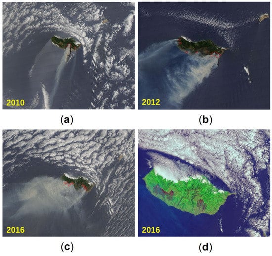 The satellite images presented in Figure 3 were obtained from the MODIS Aqua satellite observations available in the NASA’s observatory website (accessed in December 2020). In each satellite image displayed in Figure 3, the active fires can be easily identified through the smoke being transported southward. The red line contour in Figure 3a shows that in Period 1 the forest fires occurred mainly in the Madeira highlands, namely over the central part of the island in the eastern peak. Figure 3b shows forest fires occurring in the extreme west and southern slope regions during Period 2, and in larger extension in the extreme east of the island. In Period 3, Figure 3c shows the fires on August 2016 in the southern slope. For this third period, Figure 3d shows the dimension of the burned areas which also affected the foothills of the island, namely the wildland-urban interface near the Funchal city in the south-eastern region, causing three fatalities, more than 300 houses destroyed, a thousand displaced people, and ~61 million EUR of damages [].