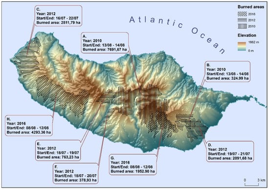 In fact, these years can be characterized by a small number of large and atypical fires that contributed to most of the burned area (Table 1), as can be seen in Figure 4. These fires spread very quickly over a short period of time, some of which resulted from more than one ignition (e.g., fire H in Figure 4).