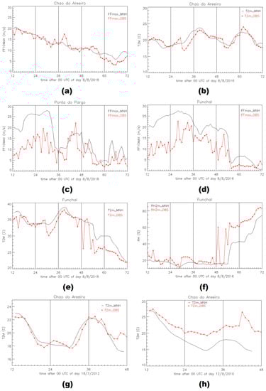 The comparisons for the other two episodes also show the ability of the model in reproducing the weather evolution, although the point-by-point comparison revealed greater differences, partially due to local effects, more visible in lighter wind situations. We select two examples. For the episode in 2012, Figure 5g indicates that the model well captures the air temperature in the Madeira highlands (Areeiro station). In the same Areeiro station (Figure 5h), the model also captures the air temperature behaviour along the 2010 period, but with a significant underestimation of the observed values. The higher observed temperatures may be a consequence of the wildfire that occurred precisely in this region, whose effects were not taken into account by the model.