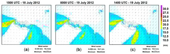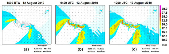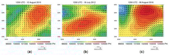 Sea level pressure and wind vectors at 1000 mb at 1200 UTC on (a) 12 August 2010; (b) 18 July 2012 and (c) 08 August 2016. Source: [].
