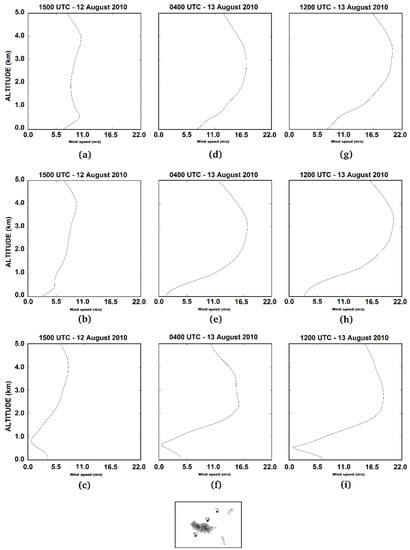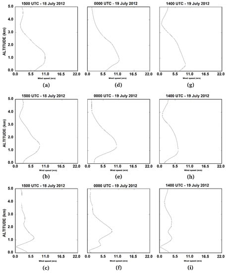 Figure 12 displays the vertical profile of the wind module at three points over the ocean (Points A, B and C at the bottom of the Figure 7) for the selected hours of Period 2. The maximum wind speed of almost 11 m/s was simulated between 500 m and 1500 m altitude during the afternoon of the 18 July (Figure 12a). Close to the northern part of the island, still over the ocean (Point B), the vertical profile of the wind module shows a decrease in the intensity of the airflow as it approached the island, with winds of 2.5 m/s below 500 m altitude (Figure 12b). There was a slight intensification of this condition, with winds of 11 m/s at 800 m altitude, at 0000 UTC (Figure 12d). At Point B, winds reached a minimum lesser than 2.5 m/s near the surface (Figure 12e). On 19 July, the wind intensity affecting the island decreased and during the afternoon (Figure 12g); for example, the maximum wind intensity at 600 m was below 10 m/s. Close to the island (Point B; Figure 12h), a decrease of airflow intensity was noticed, mainly near the surface.