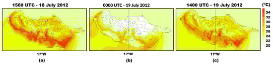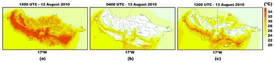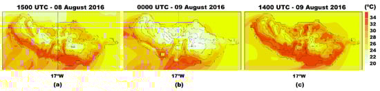 Figure 14a shows air temperatures at 2 m above 30 °C on the southern slopes, as well as maximum temperatures above 34 °C in the south-eastern part of the island. At night, milder temperatures around 25 °C were simulated in the highlands of the southern slopes, as well as 30 °C in the south-eastern foothill of the island (Figure 14b). In the early afternoon, at 1400 UTC, temperatures above 30 °C and a maximum of 34 °C in the south-eastern part of the island were simulated, but in a lesser extension (Figure 14c). The model well represents the spatial distribution of the temperature near surface when compared with the observations available during the period.