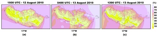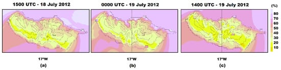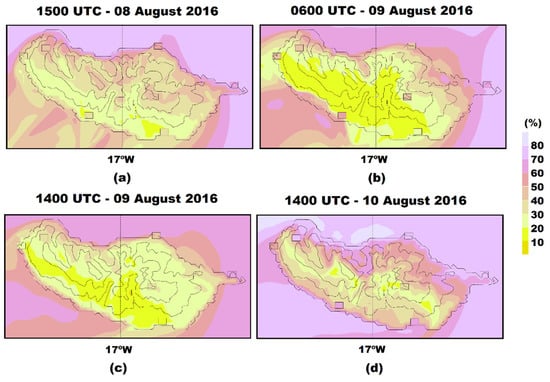 Relative humidity below 30% on the southern slopes was simulated in the afternoon of 08 August, with minimums below 20% (Figure 19a). The decrease in humidity at night was intensified by the model with values below 15% in the southern half of the island, which is not shown by observations (Figure 19b). There was a slight increase in the relative humidity throughout the day, but not exceeding 25% in the southern slopes (Figure 19c). At this moment, the model well represented the spatial distribution of the relative humidity over the island. The increase in the relative humidity values over the island gradually occurred along the rest of the period, with the minimums still simulated along the central part of the island (Figure 19d).