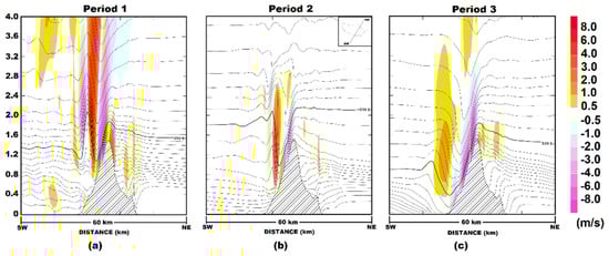 As in Period 1, Figure 12c,i together with the vertical profile of horizontal wind directions (Figure S1a,b of the Supplementary Material) show the existence of a sea breeze circulation during the afternoon.