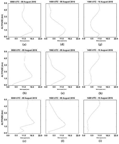 Vertical profile of horizontal wind velocity simulated at 500m resolution for Period 1. (a,d,g) for Point A (latitude: 33.05, longitude: −16.65), whereas (b,e,h) for Point B (latitude: 32.87, longitude: −16.87), and (c,f,i) for Point C (latitude: 32.58, longitude: −17.15).