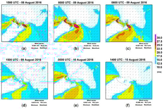 The wind gusts at 10 m are shown in Figure 17a–f. Figure 17a–c show extreme gusts over the island with speeds above 25 m/s and maximum above 30 m/s, mainly in the central region and the south-eastern part of the island. Maximums exceeding 25 m/s were observed in the southern slopes near Funchal where one of the large fires occurred (See Figure 3c,d). Wind loses intensity along the day (Figure 17d,e); however, intense wind gusts were still simulated in the west and south-eastern parts of the island. During 10 August, there were no records of significant wind gusts over the island, except in the extreme west and east of the island where a punctual maximum above 20 m/s was simulated inside the low-level western jet (Figure 17e,f). Figure 17 shows that the airflow affecting the island at lower troposphere varies between north-easterly and almost easterly along the period. In this case, Figure 11c shows that the downward motion created by orography was more intense than the upward motion simulated in the top of the island which extends up to the lowlands of the south-eastern region.