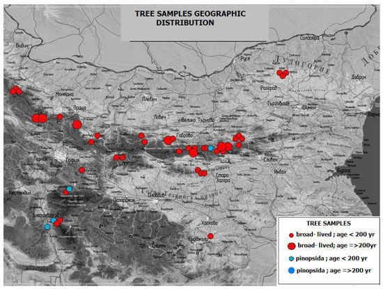 - Komitov, B.; Duchlev, P.; Kirilova, D.; Bjandov, G.; Kiskinova, N. Vruzkata “Slance-klimat” v Godishnite Prasteni na Darvetata. Parvi Rezultati ot Izsledvane na 44 Darvesni probi (The “Sun-climate” Relationship in the Tree Ring Widths. First Results of 44 Tree Samples Study); Alpha Vizia: Stara Zagora, Bulgaria, 2014; (In Bulgarian). ISBN 978-954-9483-28-4. [Google Scholar]