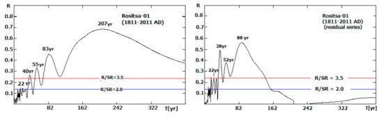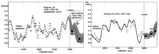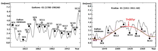 - Another important circumstance is that unlike the other five time series, the phase shifting (delay) of ‘Dm’ to temperatures and precipitations is negligible for “Gurkovo-01” and “Rositsa-01” (0 to 1 year) [41]. This helps for better and more certain interpretation of the results in relation to climate changes, as well as to “Sun–climate” connection. That is why our present study is based on the “Gurkovo-01” and “Rositsa-01” data series.