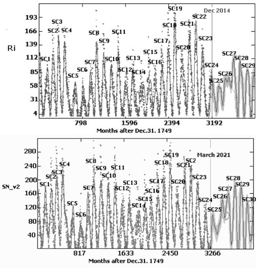 - Zharkova, V.V.; Sheperd, S.J.; Popova, E.; Zharkov, S.I. Heartbeat of the Sun from Principal Component Analysis and prediction of solar activity on a millennium timescale. Nat. Sci. Rep. 2015, 5, 15689. [Google Scholar] [CrossRef] [PubMed]
