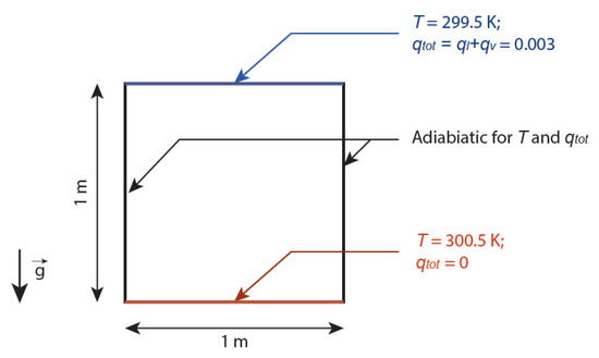 The first validation case aims at validating the capability of the method to capture buoyancy effects, including both temperature and humidity gradients. It addresses the flow in a 2D square domain with temperature and humidity differences between its bottom and top boundaries as shown in Figure 1. Two Rayleigh numbers of and as well as two grids with or half and or half were considered. Condensation was neglected and details of the model settings can be found in Feng et al.’s work [25].