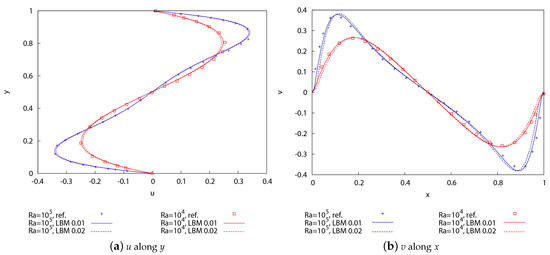 The comparison between the simulated and reference velocity profiles along the domain midlines (Figure 2), as well as local Nusselt number through the hot wall, potential temperature and total water humidity contours when the steady state had been achieved (not shown here), highlights a good performance of the developed HRR-LBM.