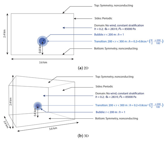 The second and third validation cases focus on a 2D and a 3D moist bubbles rising in a 2D or a 3D rectangular domain as shown in Figure 3. In both cases, the domain height was and the domain width was .