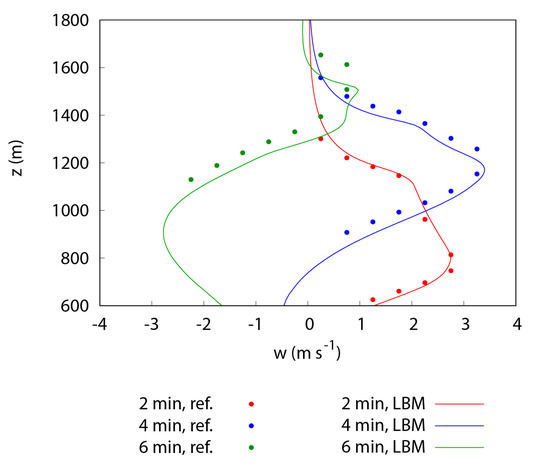 Regarding the 3D case, the good performance of the HRR-LBM model was highlighted by the comparison of the vertical velocity profiles along the midline of the domain (Figure 4) as well as liquid humidity profiles and the liquid and vapour contours (not shown).