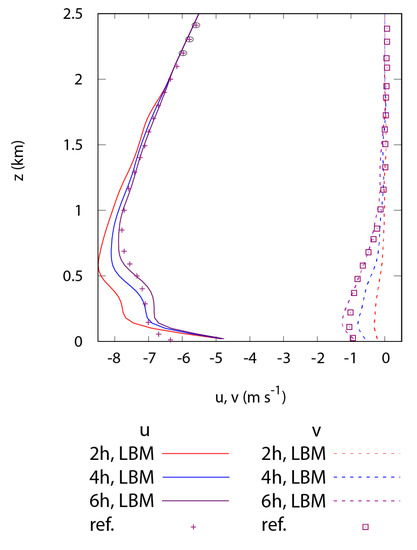 The comparison of HRR-LBM and reference results of Siebesma et al. [30] in terms of profiles of mean velocity (Figure 5), potential temperature, vapour and liquid water (not shown) highlights a good performance of the developed HRR-LBM-WMLES model, as the different atmospheric layers (mixed, conditionally unstable and inversion, from the ground upwards) and the instantaneous formation of the cloud are well captured.