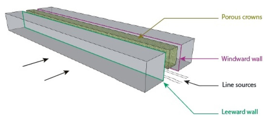 A first validation study deals with dispersion of neutral traffic such as pollutant emissions in an ideal street canyon planted or not along a centred row of more or less dense tree crowns ( and , respectively) and undergoing a perpendicular wind (Figure 6).