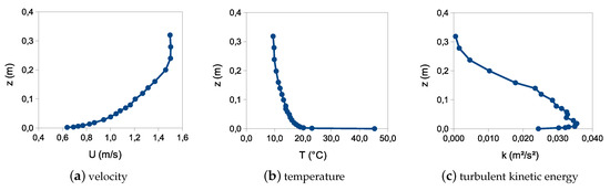 The pollutant source with a diameter of is located downstream the building. A gas flux of with a temperature of was imposed. The inflow velocity, temperature and turbulent kinetic energy were interpolated from experimental data provided in the TPU database [36] and are plotted in Figure 8.