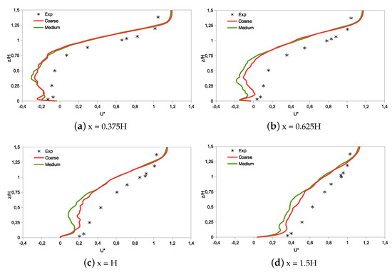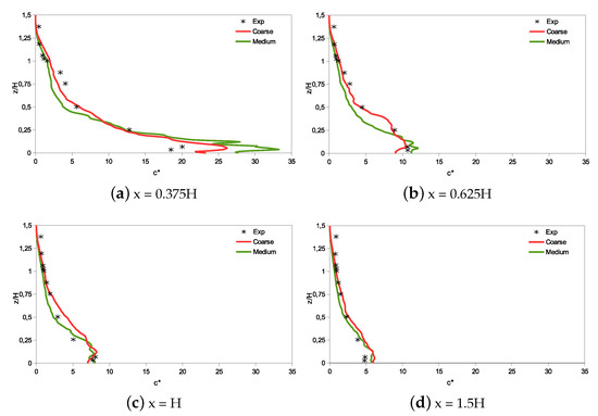 Figure 9 and Figure 10 present the comparison of the HRR-LBM results obtained with a coarse and medium grid with the experimental data of Yoshie et al. [37]. A good agreement was obtained for concentration field downstream of the building and the present results are more accurate than other literature LES simulations related to the same case [34,38]. A fairly good agreement was found for streamwise velocity profiles downstream of the building, although velocity is generally underestimated compared to experimental data.