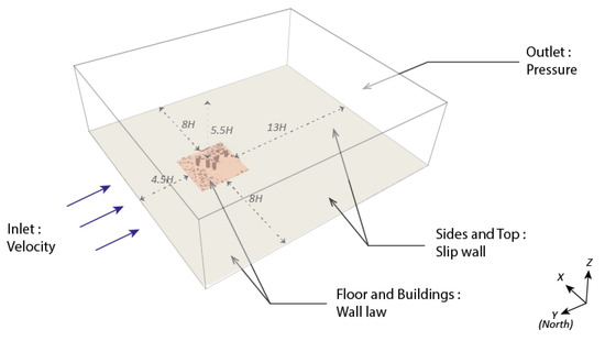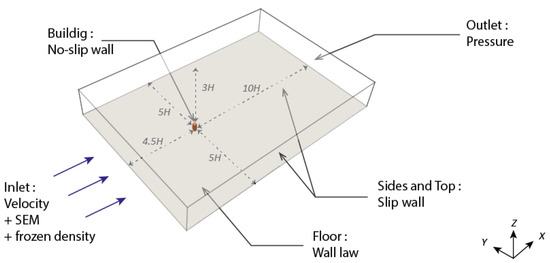 Simulations were performed at a reduced scale () as in the reference study [34], with a domain of according to AIJ guidelines [35], the building being located , and from the inlet, lateral and top domain boundaries, respectively. Table 5 gives the corresponding boundary conditions. Accounting for , s and five refinement levels for the coarse grid case and , s and six refinement levels for the medium grid case, the total number of grid points was for coarse grid and for the medium grid. Simulations were carried out on 28 or 56 cores for physical time, the last being kept to compute the statistics.