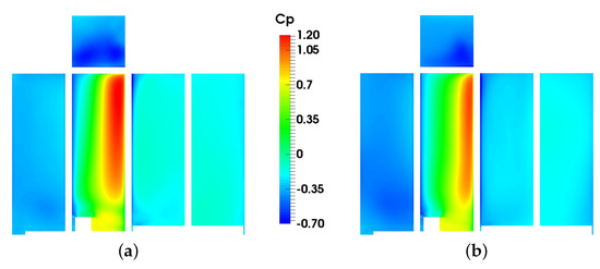Pressure coefficients obtained on the building faces for (a) the reference sample (, ) and (b) the c-APK average over the 57 samples. The building faces are presented here, from left to right, in the order east, north, west and south, with the top face on top of the figure.