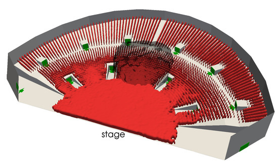 An application of this coupled method is shown here. It is related to an evacuation scenario inside a concert hall [52]. This hall (with dimensions ) contains 12 exits, indicated in green in Figure 21, and is initially occupied by 6026 persons. The concert hall is equipped with ventilation systems located on the room ceiling that allow for the balancing of the heat release of the persons in the concert hall.