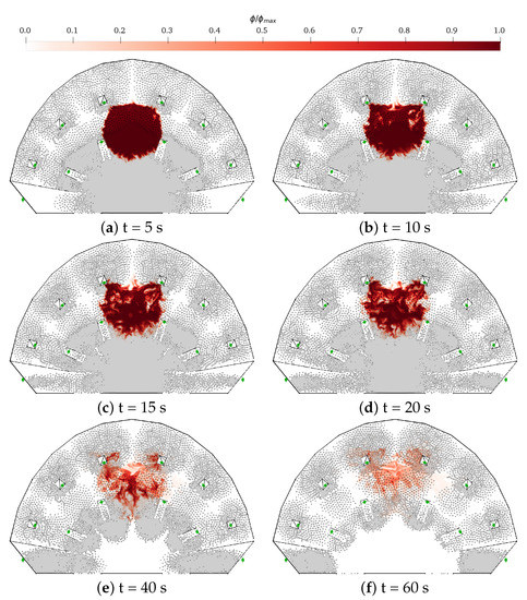 Visualisation of pollutant field at head level at different time step in case of an evacuation of a concert hall (person locations are indicated in grey).
