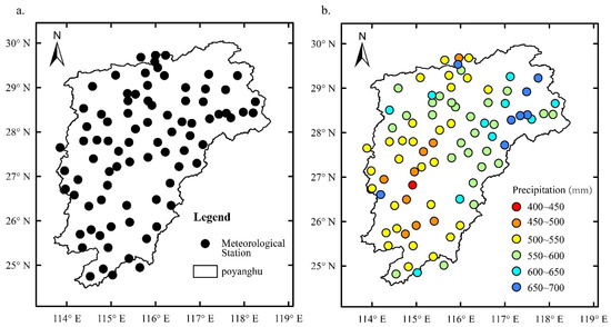 Distribution of the meteorological stations in the Poyang Lake basin. (a) the Chinese Meteorological Agency (CMA) for a total of 87 meteorological stations; (b) the summer totals precipitation climatology employed over the 1961–2016 study period.