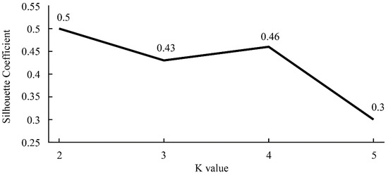 Distribution of silhouette coefficient vs. clustering number of precipitation division in Poyang Lake basin based on K-Means algorithm.