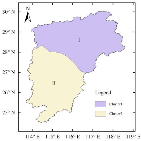 Figure 4 shows the two precipitation clusters boundaries of the PLB. From the results obtained (Figure 4), a north-south precipitation distribution can be seen, divided into two clusters. Based on the spatial pattern (Figure 4), the two clusters were expressed as cluster 1 (C1), and cluster 2 (C2), representing the northern basin and southern basin with distinct boundary obvious, respectively. The C1 covers 48 of 83 stations in the PLB, accounting for 58% of the regional station density, while Cluster2 covers 35 of 83, accounting for 42% of the station density. The region where C1(C2) was located referred to as region I (region II).