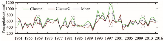 Changes in the annual precipitation in the whole basin and the two precipitation clusters over 1961–2016 in the Poyang Lake basin.