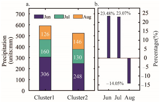 Differences of the mean sub-seasonal precipitation in June, July, and August between two precipitation clusters in the Poyang Lake basin during 1961–2016. (a) the mean precipitation magnitude of C1 and C2. (b) Percentage in June, July, and August.