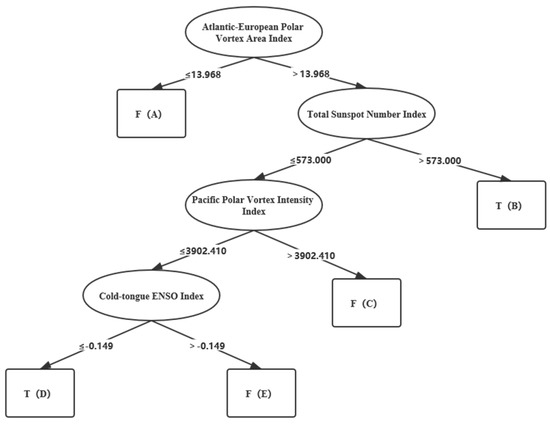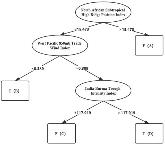 Taking “whether the summer precipitation is more than the normal or not” as the object variable, the input variables of the model were the 130-climate signal indices during the preceding spring season of the corresponding summer season. After the pretreatment, the training data were input into the C4.5 algorithm for obtaining the decision tree (Figure 7 and Figure 8). The main climate predictor of whether the summer precipitation was more than normal or not in region I (C1) was the location of the subtropical ridgeline location over North Africa.