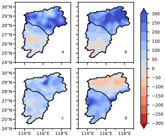 For a better description regarding the spatial distribution of the summer precipitation in the PLB under different climate scenarios of the preceding spring season. The spatial distribution of the precipitation anomaly (Figure 9) was derived using the rules for stating the factorial conditions associated with above-normal precipitation from those associated with below-normal precipitation from the decision-making tree. The regional precipitation differences owing to the set of rules derived stating whether the summer precipitation was higher than normal or not in different regions of the Poyang Lake (namely the rule B and rule D in the region I, and the rule B and rule D in the region II) in Figure 9. When the early spring climate indices were in accord with the rule B of the decision-making tree in the region I, the precipitation was higher than the normal in region I, especially in the southern and eastern reaches of region I (~>300 mm). In the northern parts of region, I, the precipitation in some parts was reduced by ~50 mm from the normal level (Figure 9a). When the early spring climate indices were in accord with the rule D of the decision-making tree in the region I, the precipitation in the whole region I was higher than the normal level by ~>500 mm (Figure 9b), especially in the mid-east parts of the region I (higher than 300 mm).