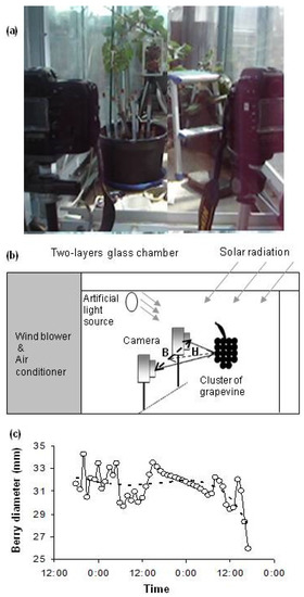 As a non-contact and non-destructive technique [43], the digital image method can be used for yield estimation, quality evaluation, disease detection, and grape phenology [44,45]. A system equipped with automated photogrammetry was developed by Moritani et al. [46] to measure soil erosion. The system could be adapted and applied to measure berry size with three major advantages: high precision, automation of monitoring berry size, and nondestructive measurement (Figure 1).