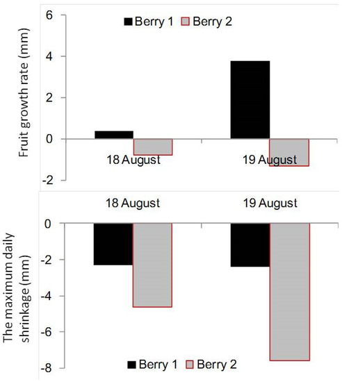 Fruit growth rate (mm) and maximum daily shrinkage (mm). The fruit growth rate was the difference between the maximum diameter of two consecutive days. The maximum daily shrinkage was the difference between the daily minimum diameter minus the maximum diameter of the former day.