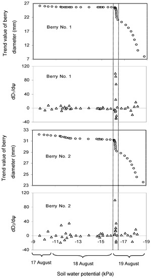 Because the berry size showed diurnal fluctuations, it was essential to remove the periodic variations using time series analysis [50]. Size fluctuations were due to water movement in tissues inducing a daily cycle of shrinkage (from the beginning of the day) and swelling (from the mid-afternoon) [51]. Periodic variations of the berry diameter were filtered by the quartic polynomial trend line, and the main secular growth trend part was obtained. Thereafter, we determined the relationship between ψ (at 0.1 m depth) and the tendency part of berry diameter.