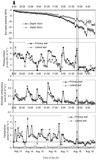 In the first five days, the highest values of AN and gs occurred during the daytime and the lowest values occurred during the night (Figure 4). Before ψ decreased to −13.2 ± 0.82 kPa, photosynthesis, gs, and E fluctuated in a normal range, that is, they could recover to a high value. However, when ψ decreased from −13.2 ± 0.82 kPa to −14.7 ± 0.84 kPa, AN decreased from 7.1 to 0.38 µmol CO2 m−2 s−1 for the primary leaves (the leaves on the primary shoot). In addition, in the following 33 h, AN fluctuated in a low-value range. The measured AN, gs, and E for the primary and lateral leaves showed a similar trend.