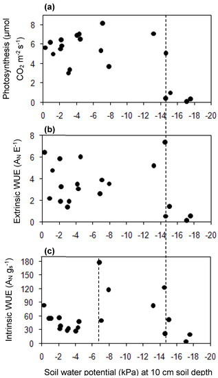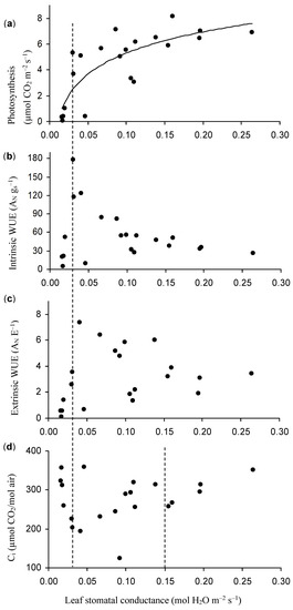 When gs (in the morning) decreased from 0.26 to 0.03 (or 0.04) mol H2O m−2 s−1, the intrinsic and extrinsic WUE increased (Figure 7b,c). Thereafter, a significant decrease occurred in the intrinsic and extrinsic WUE (Figure 7b,c) when gs (in the morning) decreased from 0.03 to 0.02 mol H2O m−2 s−1, during which the average ψ reached −14.7 kPa (Figure 4). When gs decreased to 0.017 mol H2O m−2 s−1, photosynthesis, and intrinsic and extrinsic WUE became almost zero (Figure 7a–c). The sub-stomatal CO2 concentration (Ci) decreased with decreasing gs (in the morning) in the ranges of 0.26 and 0.03 mol H2O m−2 s−1; however, it increased steeply when gs decreased beyond 0.03 mol H2O m−2s−1 (Figure 7d).