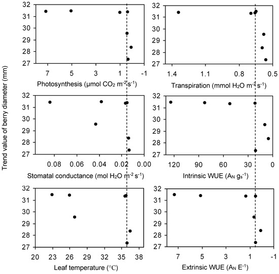 The relationship between the leaf physiological parameters and berry growth of grapevine is shown in Figure 6. When leaf transpiration (in the morning) decreased from 1.38 to 0.69 mmol H2O m−2 s−1, the trend value of berry diameter did not decrease significantly and was maintained at a value > 31 mm. However, the trend value of berry diameter decreased fast (<30 mm) when transpiration decreased beyond 0.69 mmol H2O m−2 s−1 (Figure 6). The relationships among berry diameter and photosynthesis, gs, leaf temperature, and intrinsic and extrinsic WUE of the primary leaves of the grapevine also showed a similar trend. When leaf temperature was too high, or photosynthesis, transpiration, gs, intrinsic and extrinsic WUE were too low, the berry contracted as expected (Figure 6). In future experiments, we would place the potted plant over a digital balance and measure the whole grape water use.