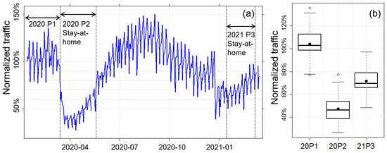 (a) Normalized daily traffic counts in greater Toronto area. Data are from Apple mobility data (https://covid19.apple.com/mobility, accessed on 29 June 2021). The reference traffic is on 13 January 2020; (b) Box and whisker plot for traffic data from panel (a) in three periods: Period 1 in 2020, Period 2 in 2020, and Period 3 in 2021. The line in the box denotes the median, the filled dot in the box denotes the mean, the lower and upper bounds of box show the 25th and 75th percentiles, and the whiskers show ±1.5× interquartile range (IQR) from the bounds of the box. Open circles are data beyond the whiskers.