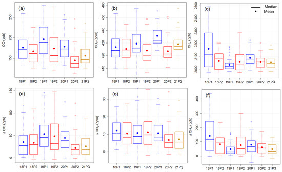 Box and whisker plots of daily 12:00 to 16:00 local time average dry-air mole fractions for (a) CO, (b) CO, and (c) CH, and enhancements above background for (d) CO, (e) CO, and (f) CH. Seven boxes are for the seven periods examined: “18P1” for 2018 Period 1, “18P2” for 2018 Period 2, etc. These periods are also color coded as blue for Period 1, red for Period 2, and brown for Period 3 in 2021. The description of the box and whisker plots is the same as for Figure 1b.