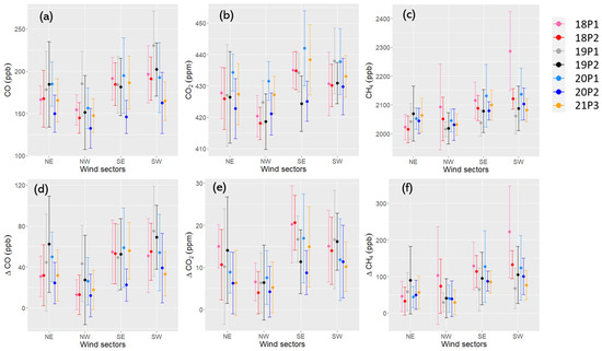 Plots of afternoon (12:00 to 16:00 local time) average of (a) CO, (b) CO, (c) CH, (d) CO, (e) CO, and (f) CH in four wind direction sectors over the seven periods examined. These periods (see legend) are defined in the manuscript (see Table 2): “18P1” for 2018 Period 1, “18P2” for 2018 Period 2, etc. Circles denote the mean, and error bars denote the standard deviation. Wind direction = 0 means wind is from north. NE: wind is from northeast (0–90); SE: wind is from southeast (90–180); SW: wind is from southwest (180–270); NW: wind is from northwest (270–0).
