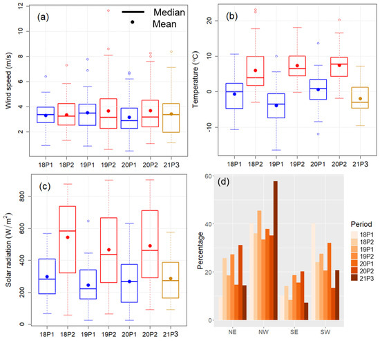 Box and whisker plots of daily afternoon (12:00 to 16:00 local time) (a) wind speed; (b) temperature; and (c) solar radiation measured from the roof of the MP building during the examined periods: “18P1” for 2018 Period 1, “18P2” for 2018 Period 2, etc. The description of the box and whisker plots is the same as for Figure 3. (d) Frequency of wind within each wind direction sector in the afternoon (12:00 to 16:00 local time) measured from the roof of the MP building. The bar represents a period as noted by legend.