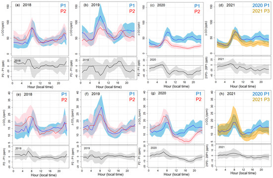 Diurnal variations of (a–d) CO and (e–h) CO on weekdays. Hour is local time. Blue shows results of Period 1, and red shows results of Period 2. Orange in (d,h) shows results of 2021 Period 3 (stay-at-home period). Solid lines show the hourly means and the corresponding shades mark the 95% confidence intervals of the means. Black lines show Period 2 minus Period 1 in each year except for 2021. In (d,h), the black lines show 2021 Period 3 minus 2020 Period 1. Gray shades are the 95% confidence intervals of the difference.