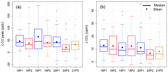Box and whisker plot of (a) calculated CO peak in Section 2.4 on weekdays and (b) daily CO from 12:00 to 16:00 local time on weekdays for the seven periods examined. The description of the box and whisker plots is the same as for Figure 3.