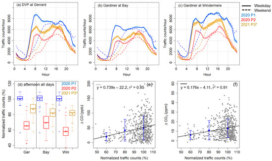 Diurnal variations of traffic counts at three intersections in downtown Toronto in 2020 and 2021: (a) DVP at Gerrard Street, (b) Gardiner at Bay Street, and (c) Gardiner at Windermere Avenue. Solid lines show the hourly means and corresponding shading marks the 95% confidence interval of the mean on weekdays, and dashed lines show the hourly means on weekends. (d) Normalized daily afternoon traffic counts for 2020 Period 1 (blue), 2020 Period 2 (red), and 2021 Period 3 (brown) at the same sites (Gerrard Street “Ger”, Bay Street, and Windermere Avenue “Win”). The reference for data normalization is the mean traffic for 2020 Period 1. The description of the box and whisker plot is the same as for Figure 1b. Scatter plots of daily afternoon (e) CO and (f) CO vs. average normalized daily afternoon traffic counts at the three sites over the entire study period from November 2017 to March 2021. Blue points show average CO or CO along the normalized traffic counts in three bins (50–70%, 70–90%, and 90–110%); the error bars represent 1; and the solid line shows the linear regression of the blue points.