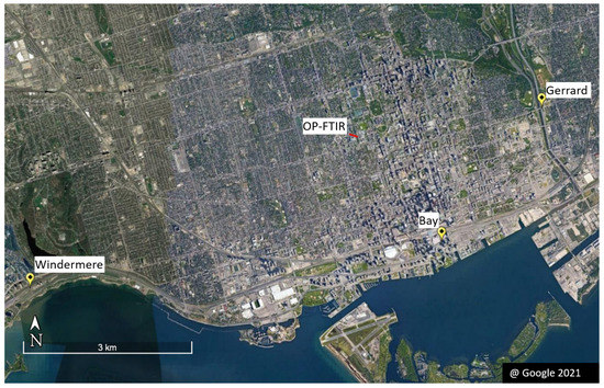 Locations of the OP-FTIR system and three sites for traffic data from the City of Toronto. The map was retrieved from Google Earth Pro on 14 April 2021.