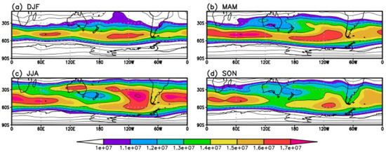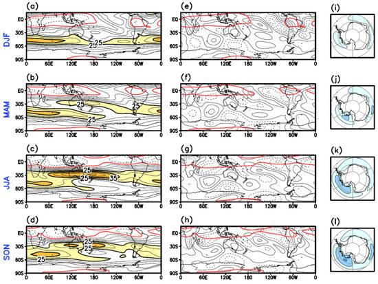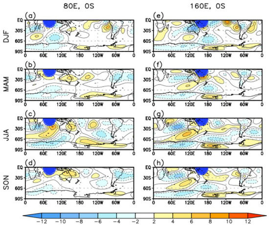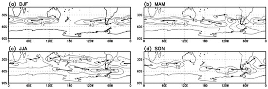 Before investigating tropical-extratropical teleconnection, the basic flow in different seasons should be examined. In Figure 1, the climatological zonal wind shows strong values in westerly regions near 30° S and 50° S—that is, the locations of the subtropical and polar jets, respectively—regardless of the season. The subtropical jet is strong in JJA and SON with a maximum near 180° E (Figure 1c,d) and disappears in DJF (Figure 1a). The polar jet has a similar intensity in all seasons but the longitudinal location of its center differs depending on the season; in DJF, the polar jet has two centers around 30–60° E and 100° W (Figure 1a), while the latter center does not exist in MAM/JJA/SON (Figure 1b–d). Thus, the polar jet in MAM/JJA/SON becomes zonally localized. An important feature of the austral winter is the presence of a double jet which is identified as the westerly regions with values greater than 35 m/s centered near Australia and 50° S, 40° E (Figure 1c). In the tropics, there is a region where the zonal wind is near to or less than zero, which extends from the tropical West Atlantic Ocean to the date line and South America in DJF/MAM (Figure 1a,b). According to the classic Rossby wave theory, the barotropic Rossby wave cannot penetrate this easterly region, so the wave only crosses the equator through the westerly region over the Central and Eastern Pacific; this tropical westerly region is referred to as “westerly ducts” [41]. During JJA/SON, since the easterly region appears over the tropics (Figure 1c,d), the cross-equatorial wave propagation cannot be easily explained [36]. However, in the modified Rossby wave theory considering an effect of the meridional wind, the background meridional flow makes it possible for the Rossby wave to pass through the easterly region [39,40]. Particularly, the dominant northerly over the eastern Indian Ocean and the Western Pacific in JJA/SON allows inter-hemispheric propagation, and these “northerly ducts” can be a waveguide for the southward-propagating Rossby wave (Figure 1g,h) [27,42].
